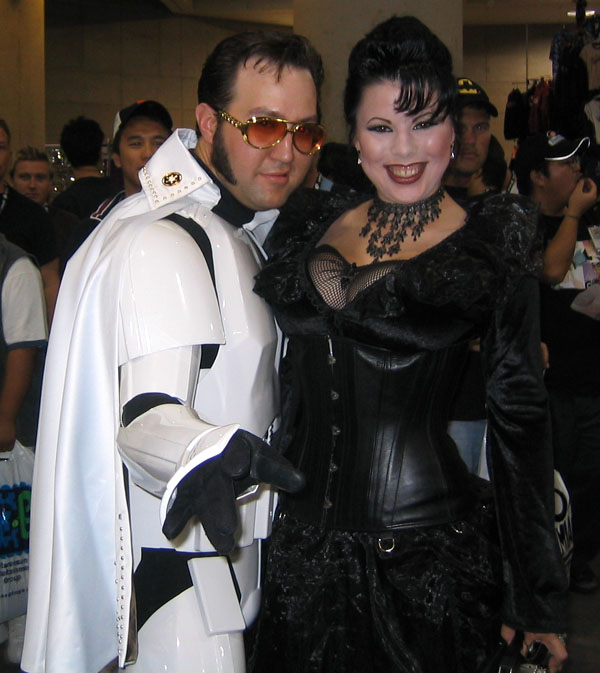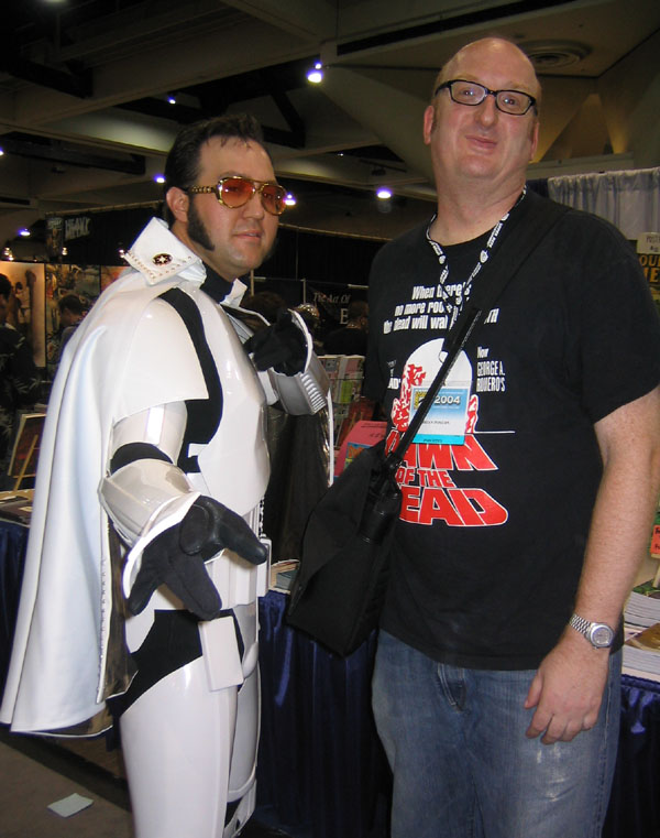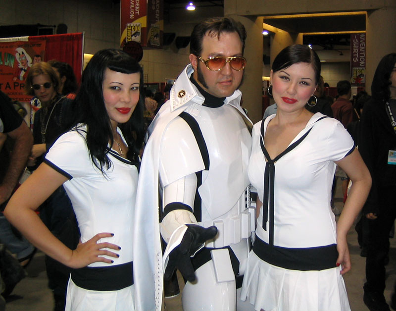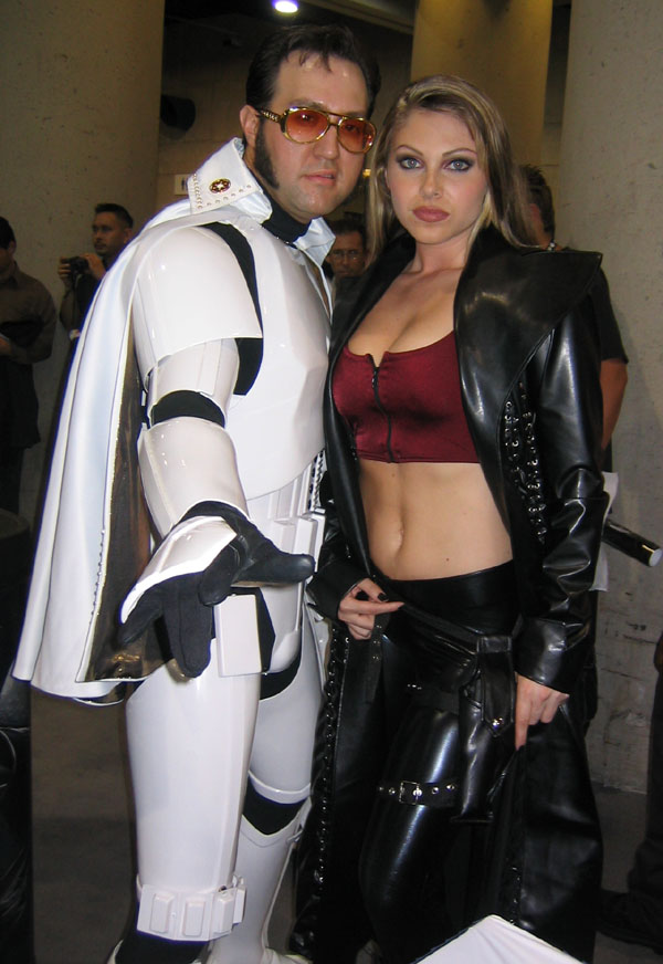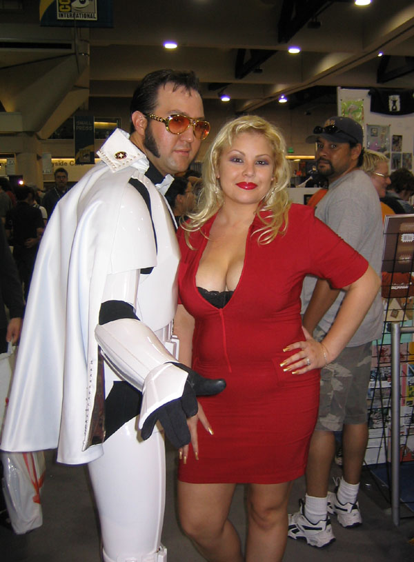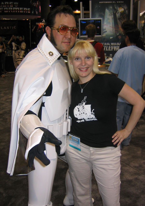 Yes, the rumors are true and your eyes aren't deceiving you, it's an all new Elvis Trooper for '04! Once again we find our hero at his favorite Con, the San Diego Comic Con 2004. How can it be, but this year the Con was bigger than ever which means more and more fans for him to meet, greet, and take pictures with. And a few lucky people even walked away with their very own Elvis Trooper T-shirt as a souvenir of the time they spent with the him, hey what a nice guy this Elvis Trooper must be. I wonder if any of the girls did anything special to get a T-shirt, well it's probably best not to even ask such questions that could only lead to trouble. Now onto a few of the more respectable pictures that we were able to find of the Elvis Trooper at San Diego Comic Con 2004. |
